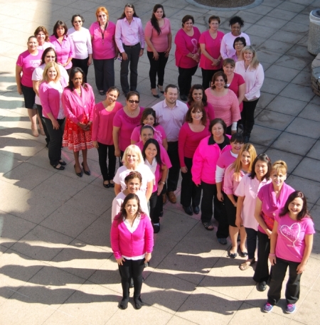 Picture of a The Breast Center Staff standing outside in a form of a Breast Cancer Awareness ribbon. They are all wearing pink shirts.