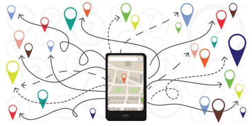 Picture of a tablet that has a map with location pen and numerous location pins with arrrows.